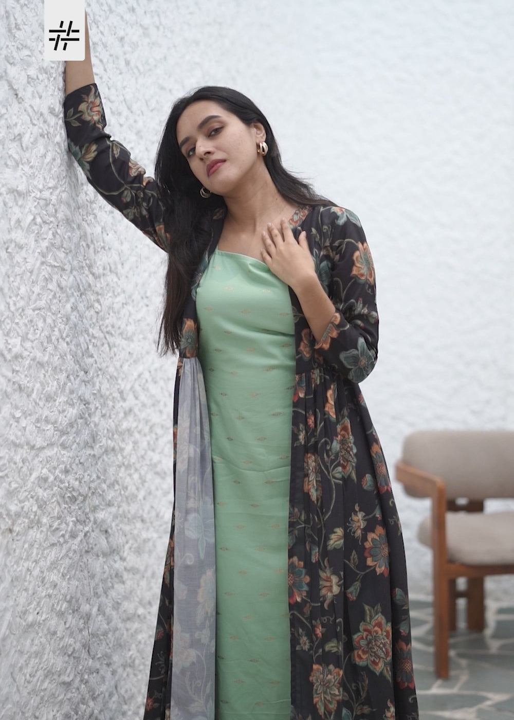 A grand shrug dress ensemble featuring a black with multicolour floral print mandarin collar shrug with three quarter length regular sleeves, fitted waist, gathered hem, paired with a long green with golden print sleeveless inner dress with square neck and semi flared hem.