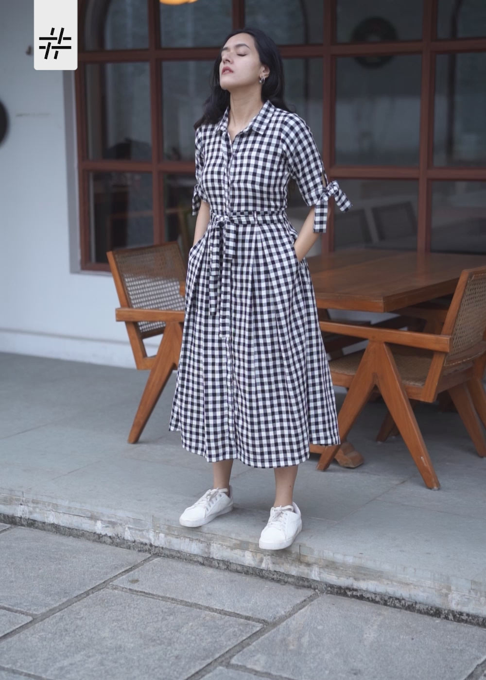 A classy black & white checked dress featuring shirt collar neck, elbow length sleeves with hem tie, straight waist with tie & pockets, box pleated hem and button detailing at the front.