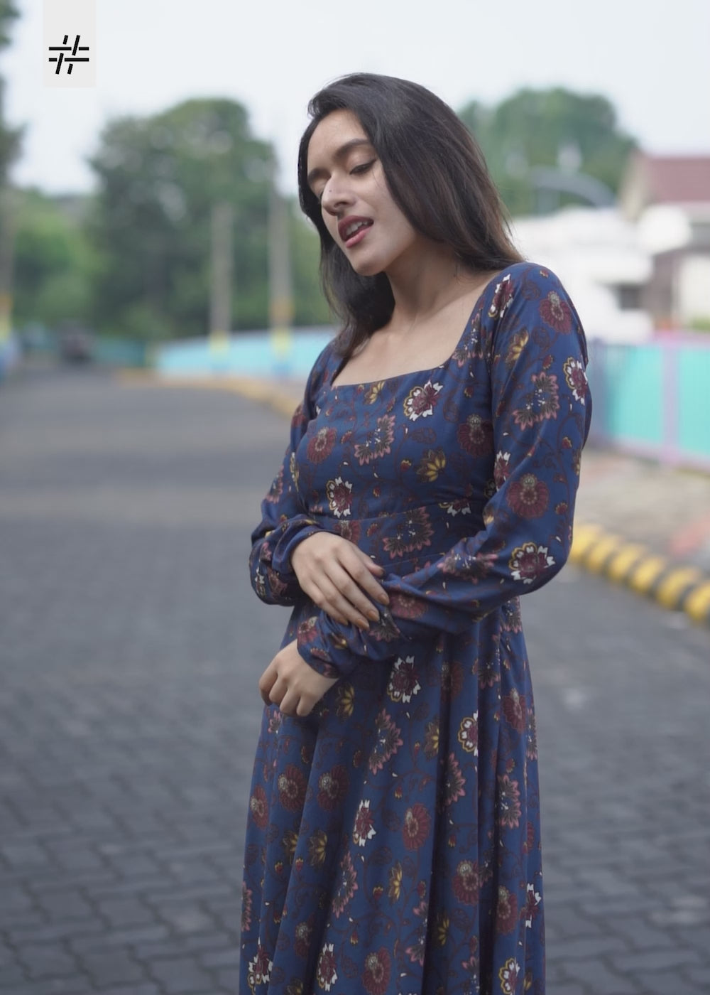 A graceful blue & multicolour floral print dress featuring wide neck, long churi sleeves, fitted waist and flared hem.
