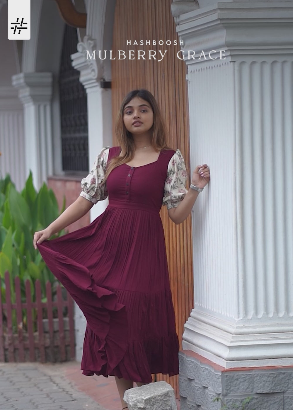 A graceful burgundy & beige solid & block print motif dress featuring sweetheart neck, elbow length puffed sleeves, fitted waist, flared hem and button detailing at the front.