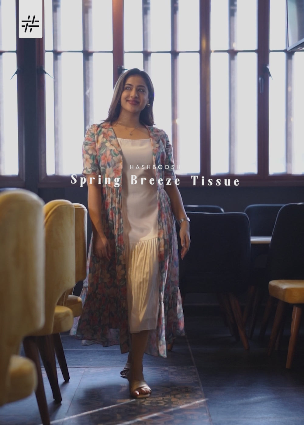A grand shrug dress ensemble featuring a grey & multicolour floral print coat collar tissue shrug with elbow length puffed & pulled sleeves, fitted waist, gathered hem and button detailing at the front., paired with a long cream sleeveless inner dress with boat neck and semi flared hem.