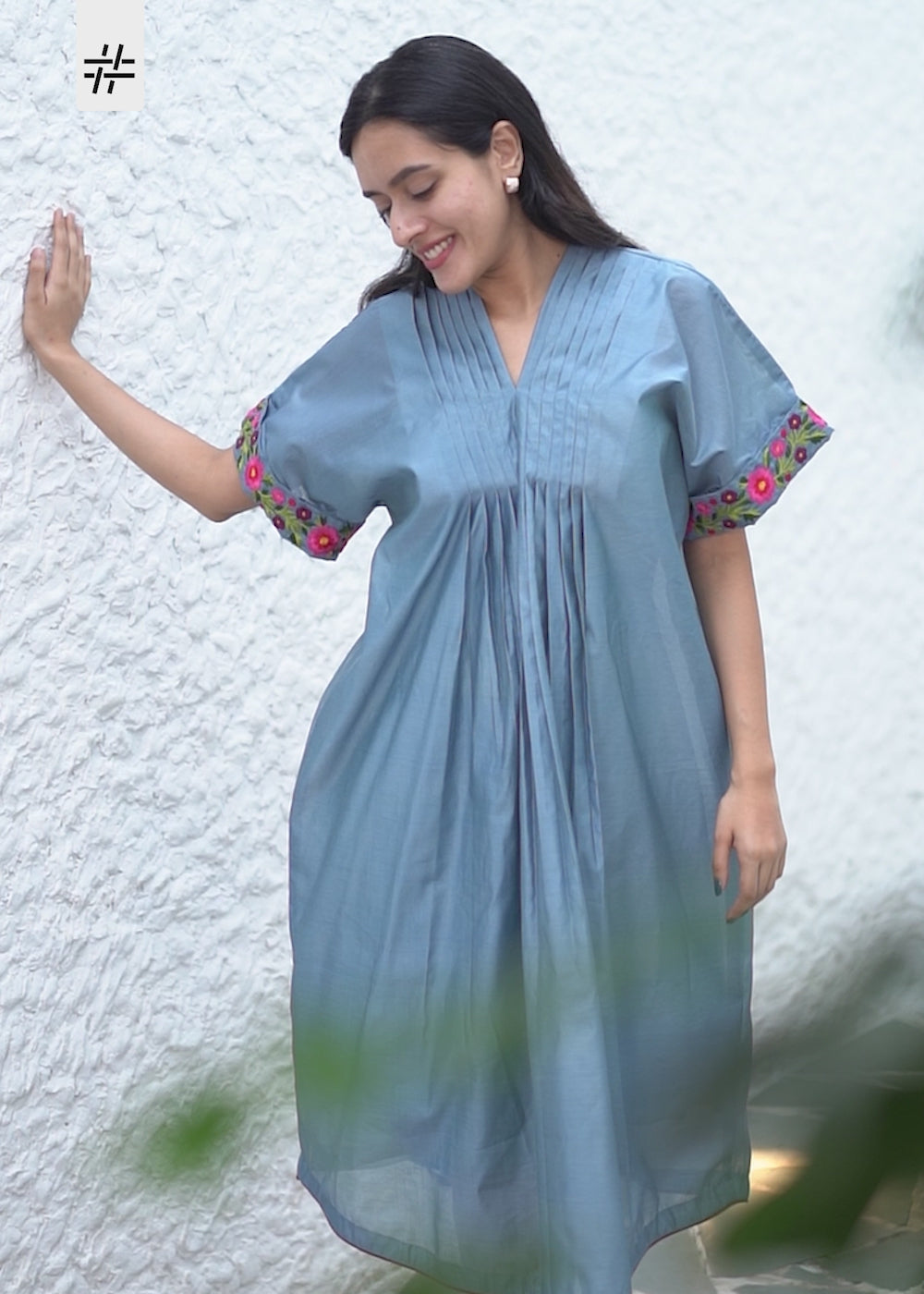 A beautiful dusty blue kaftan featuring V neck with pleated yoke with multicolour floral hand embroidery detailing at the sleeves.
