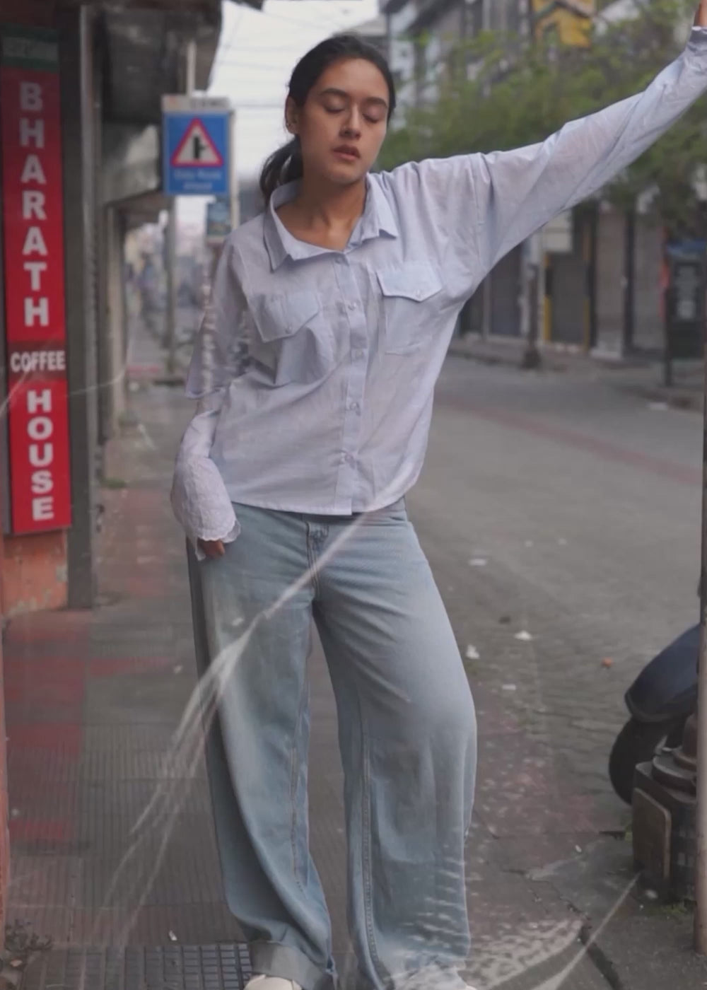 A relaxed fit light blue striped shirt featuring buttoned flap pockets and full sleeves with white embroidery on the cuffs.