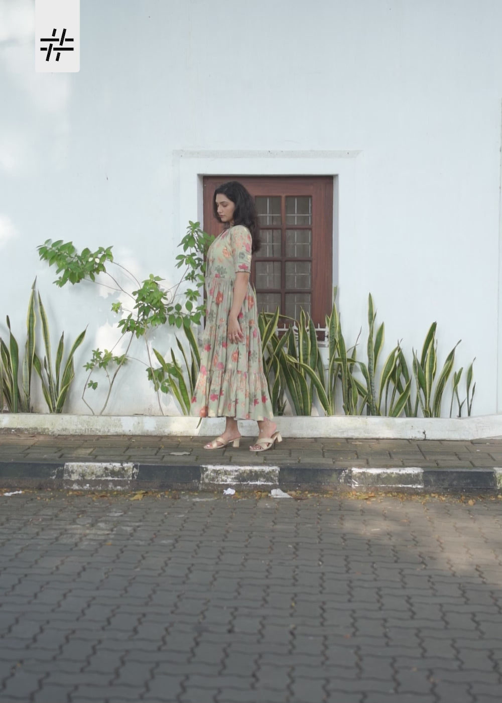 A grand shrug dress ensemble featuring a light green & multicolour floral print mandarin collar flax linen shrug with elbow length plain sleeves with pleats at the end, fitted waist, flared hem, paired with a long muted grey tissue sleeveless inner dress with boat neck and semi flared hem.