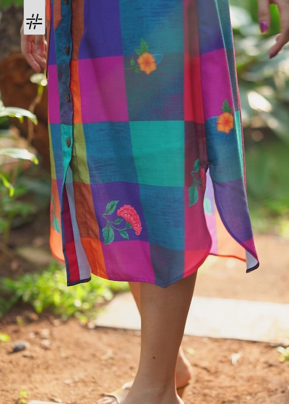 A beautiful multicoloured checked & floral print linen dress featuring shirt collar neck, short rolled cuff sleeves, straight waist with tie, semi flared hem and button detailing at the front.