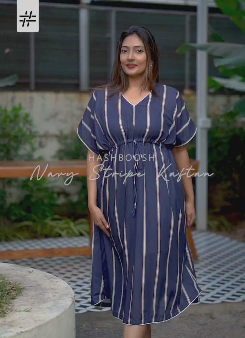 A graceful navy blue & cream striped kaftan dress featuring V neck, below elbow direct sleeves, relaxed waist with tie and flared hem.