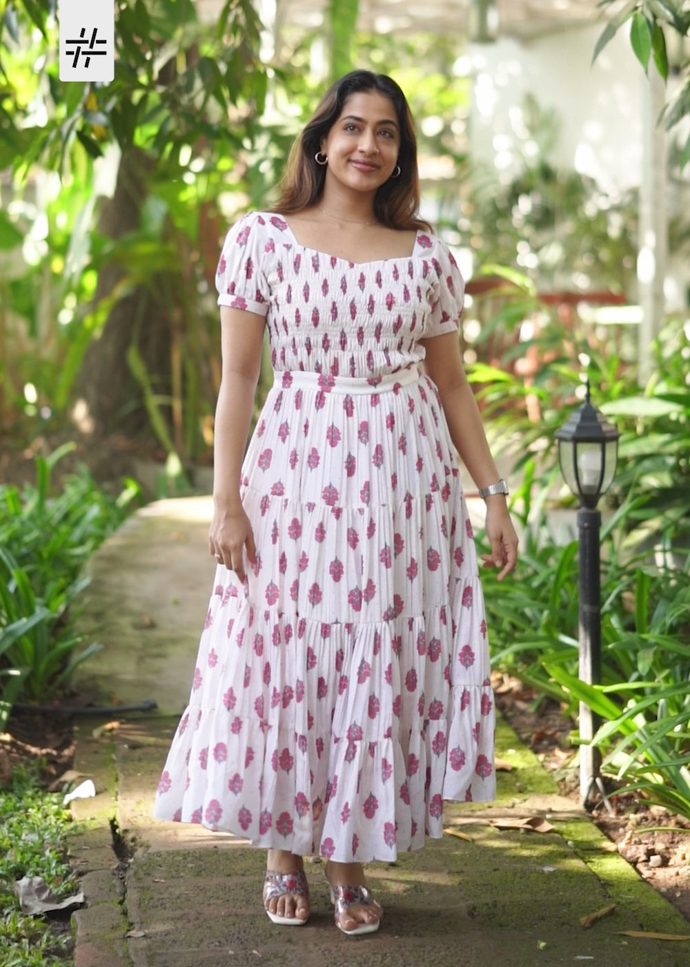 A classy off white & magenta floral print dress featuring wide neck, smocked yoke, short puffed sleeves, fitted waist and flared hem.