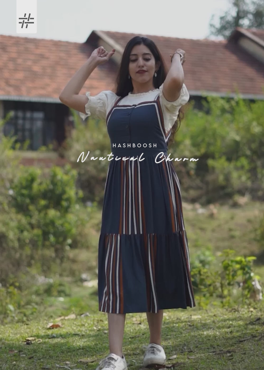 A chic pinafore ensemble featuring an off white gathered round neck inner top with above elbow puffed sleeves with elastic paired with a navy blue with white, grey striped pinafore dress with wide neck, fitted & gathered waist, flared hem and button detailing at the front.