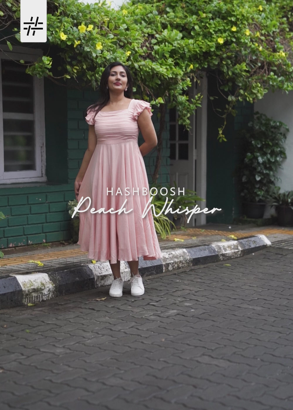 A graceful peach & maroon micro doted print dress featuring square neck, short flutter sleeves, straight waist and flared hem.