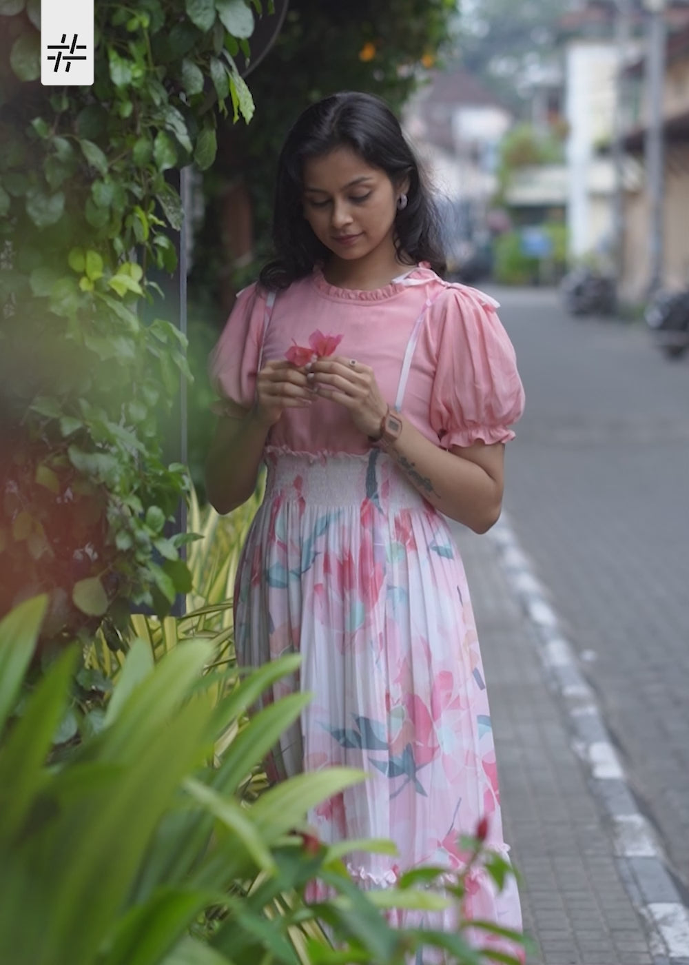 A beautiful peach & multicolour abstract print dress featuring gathered round neck, elbow length puffed sleeves, straight elasticated waist with tie up shoulder straps and gathered hem.