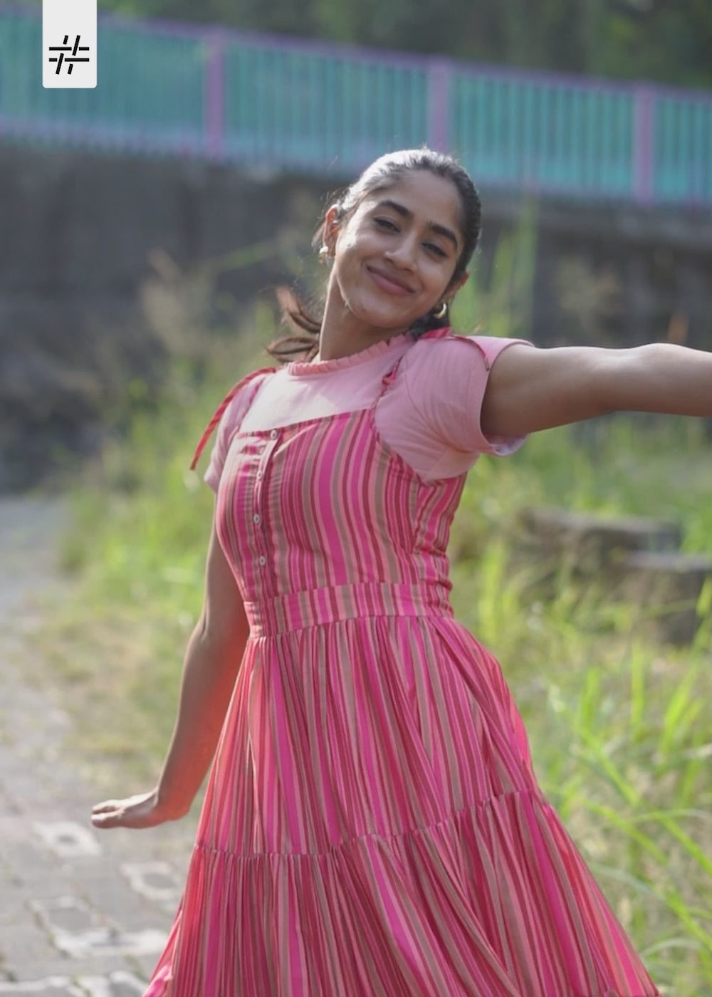 A chic pinafore ensemble featuring a pink gathered round neck inner top with short sleeves paired with a peach with multicolour striped muslin pinafore with wide neck, tie up shoulder straps, straight waist, flared hem and button detailing at the front.