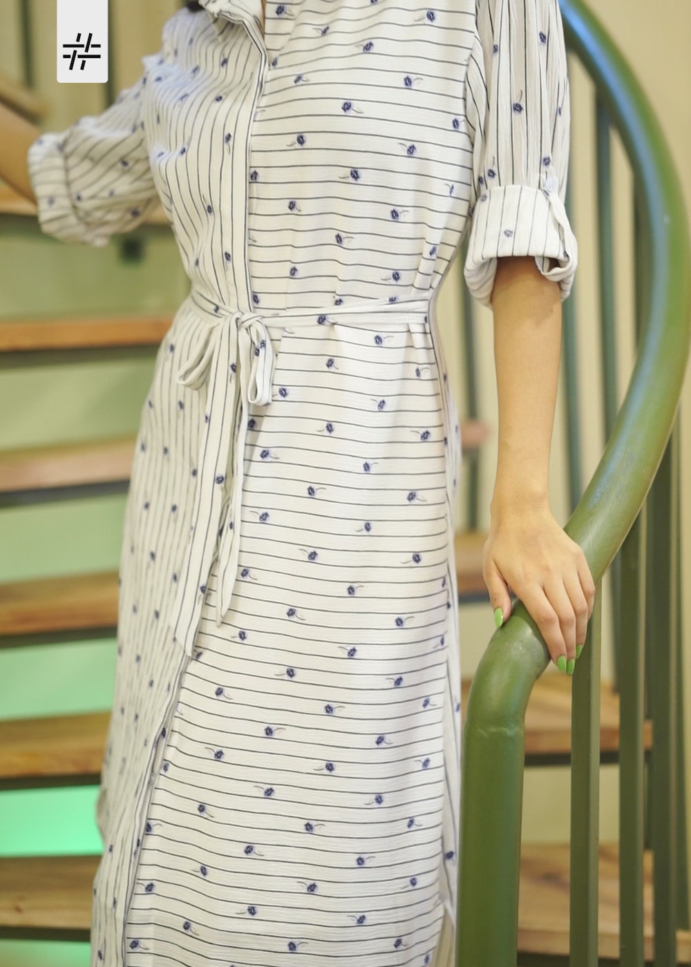A classy white striped dress with black & blue floral print featuring shirt collar neck, full sleeves with cuff and button, straight waist with tie, semi flared hem and button detailing at the front.