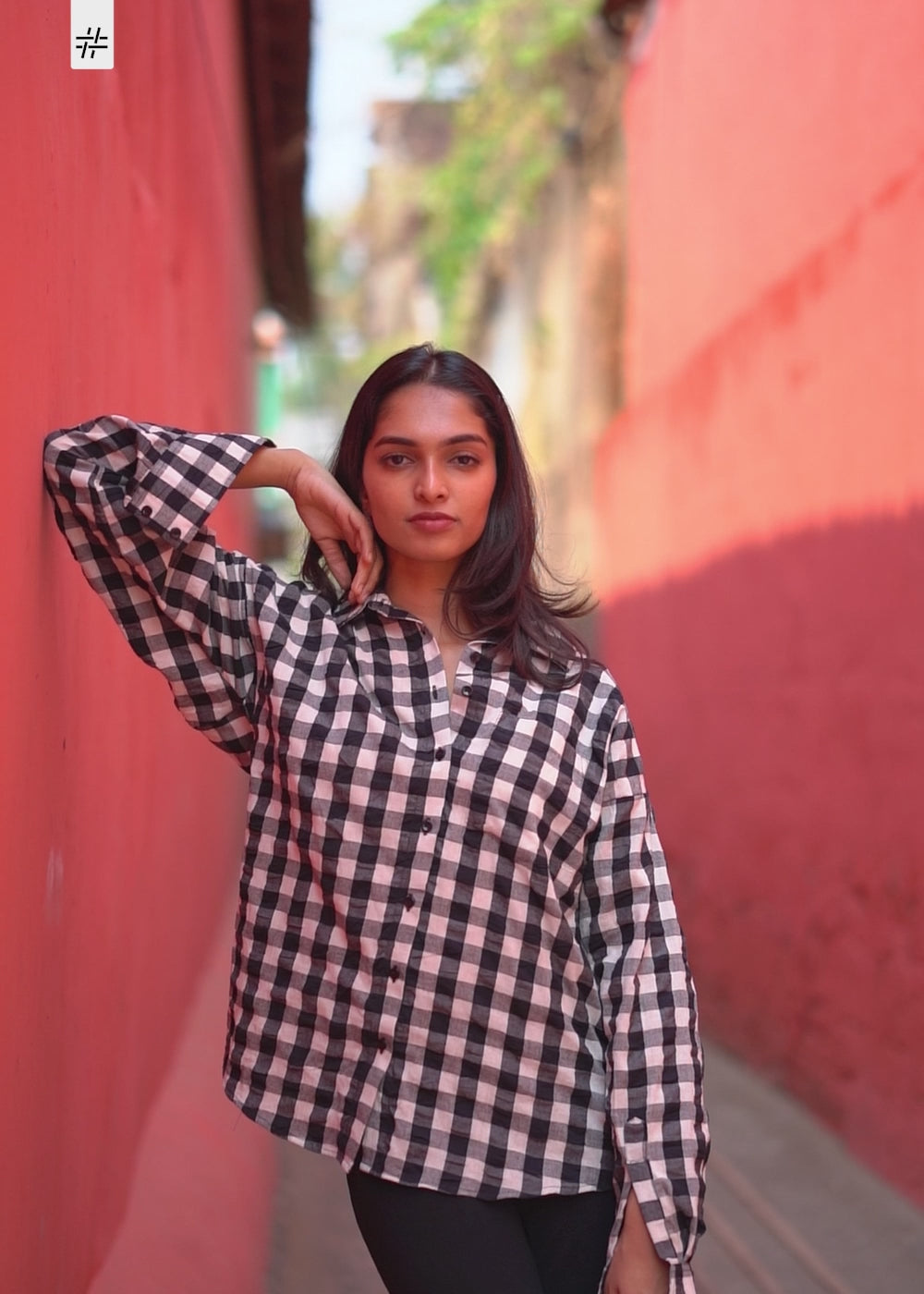 A relaxed-fit white & black checked shirt featuring a sharp shirt collar, full sleeves, and classic cuff detailing—subtle flex, strong stance, natural scene-stealer.
