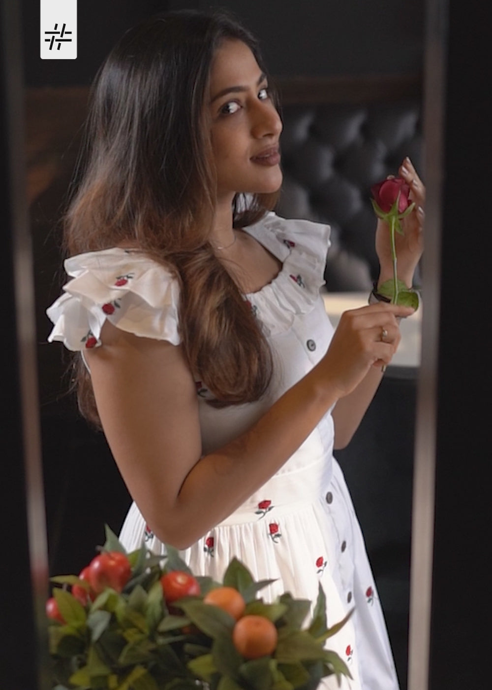 A classy white & red floral machine embroidery print muslin dress featuring square neck, short ruffled sleeves, fitted waist, flared hem and button detailing at the front.