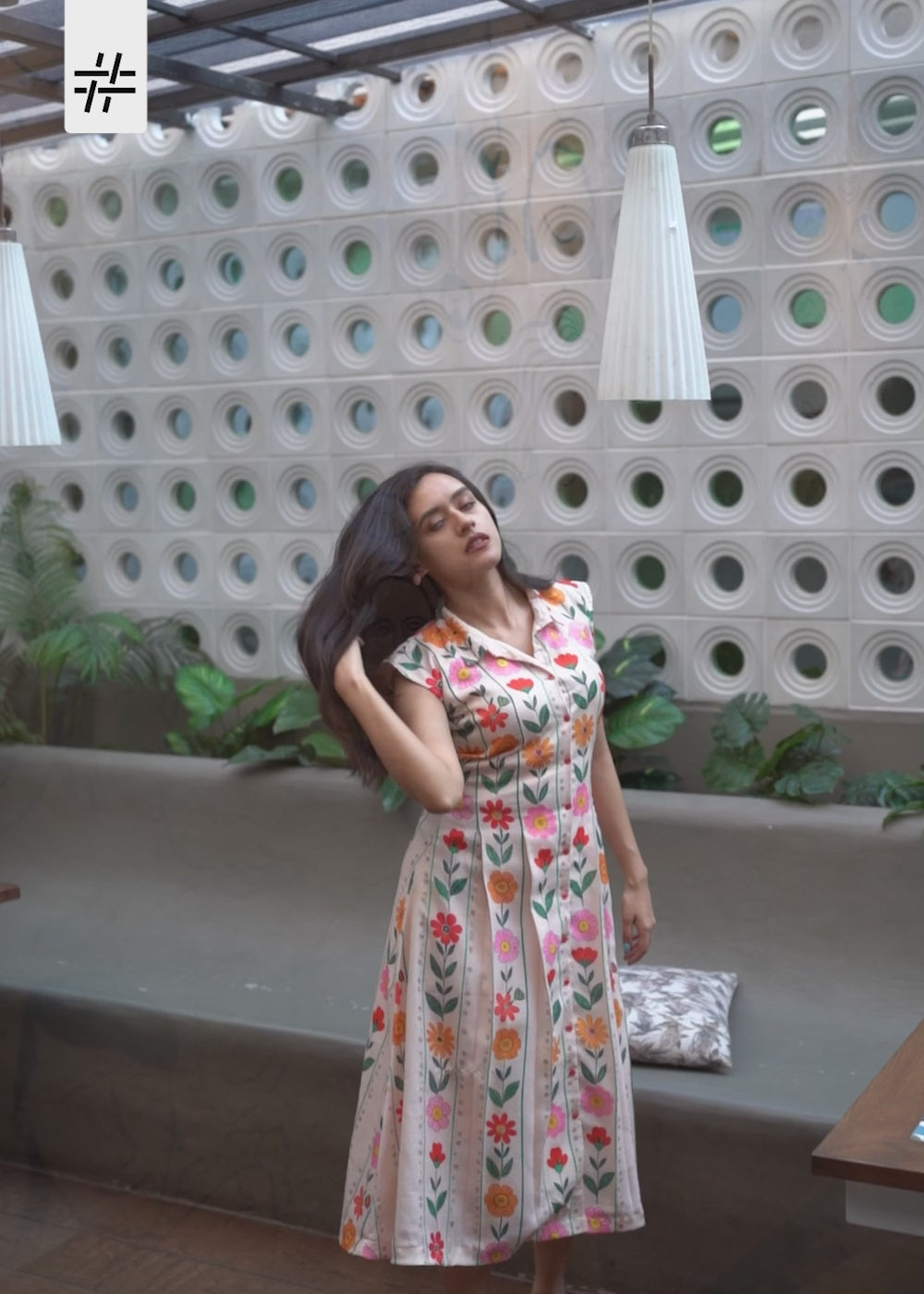 A graceful white & multicolour floral print linen dress featuring shirt collar neck, short extension sleeves, straight waist with tie, box pleated hem and button detailing at the front.